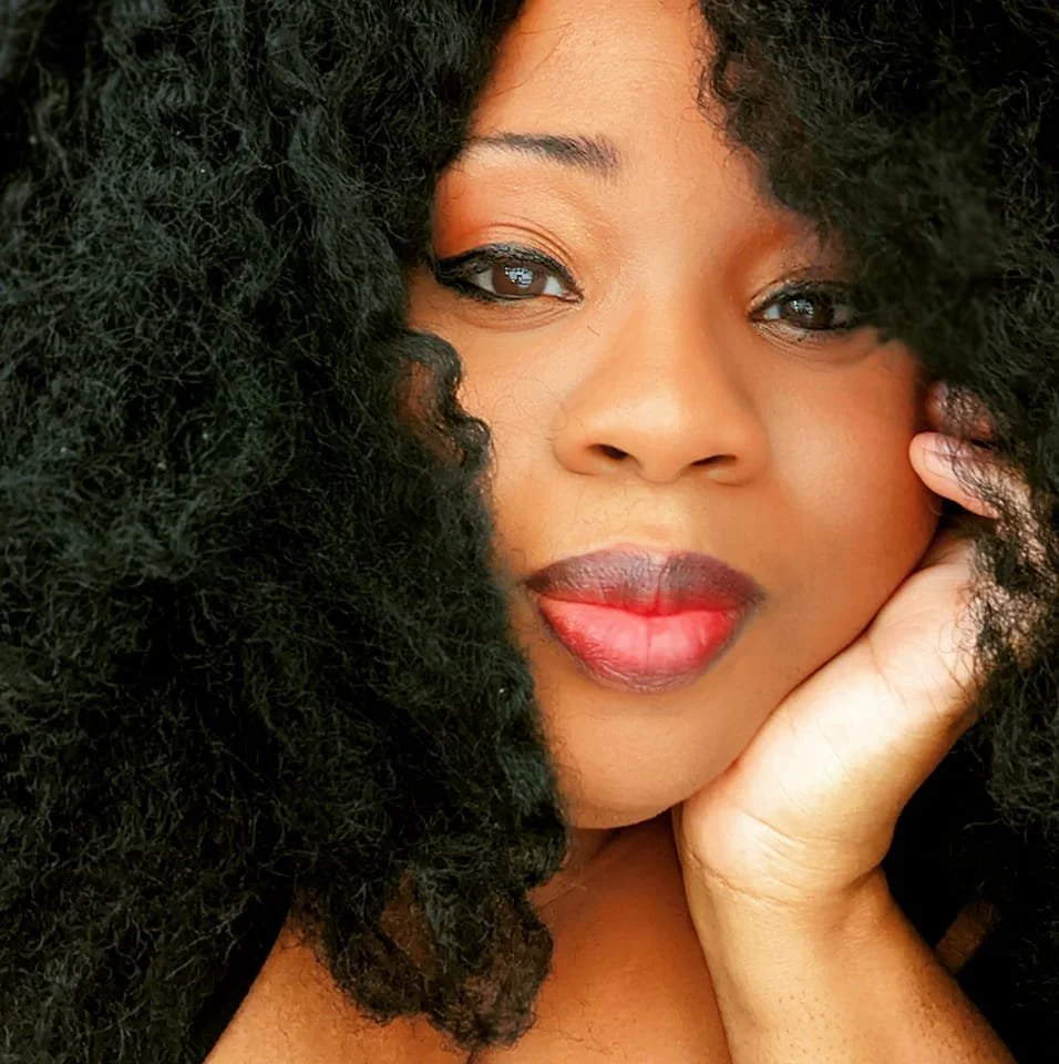 Rawiyah, a fat Black nonbinary person, sits close to the camera with their face in one hand. They have curly black hair and are wearing black eyeliner, warm eyeshadow and red lipstick.