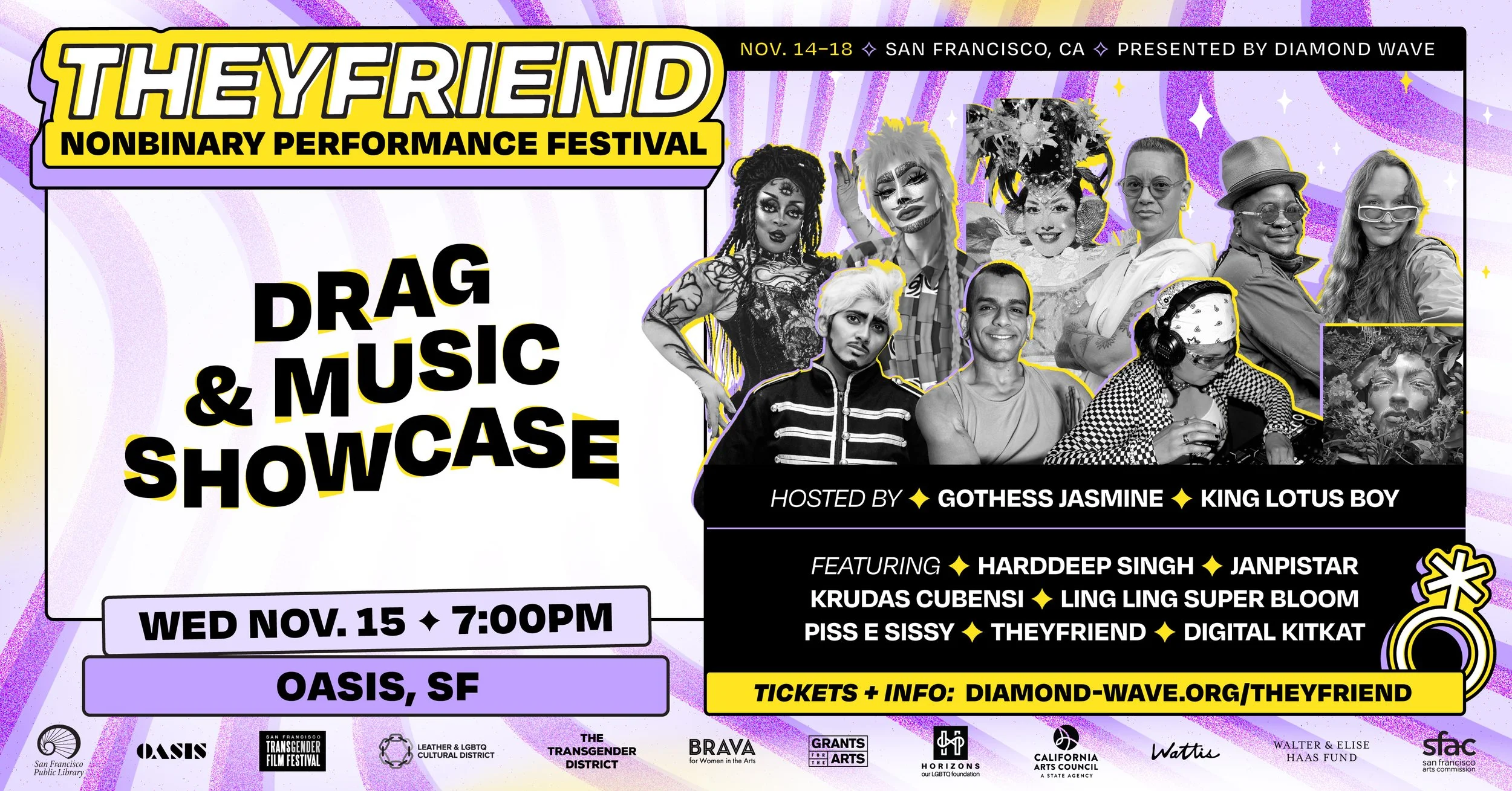 Join us for day two of the 2023 THEYFRIEND Nonbinary Performance Festival for a showcase centering nonbinary musicians and drag artists at San Francisco’s premiere LGBTQ nightlife venue, Oasis! Co-hosted by the 2023 San Francisco Drag King of the Year LOTUS BOY and drag deity Gothess Jasmine (Austin), this sensational showcase of nonbinary performance will feature live music from Krudas Cubensi and theyfriend (LA), and drag and burlesque performances from Harddeep Singh (London), JanpiStar, Ling Ling Super Bloom, and Piss E Sissy! Come early and stay late to dance to the stellar beats by DJ Digital Kitkat.